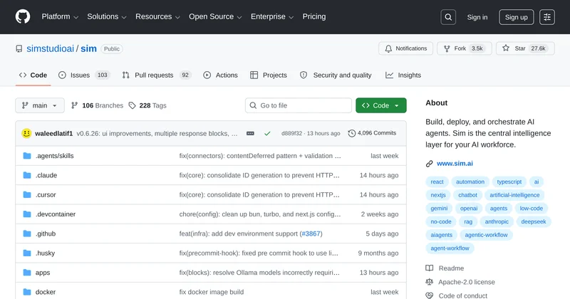 Sim is an open-source platform for building and orchestrating AI agents, integrating numerous tools and workflows with ease.