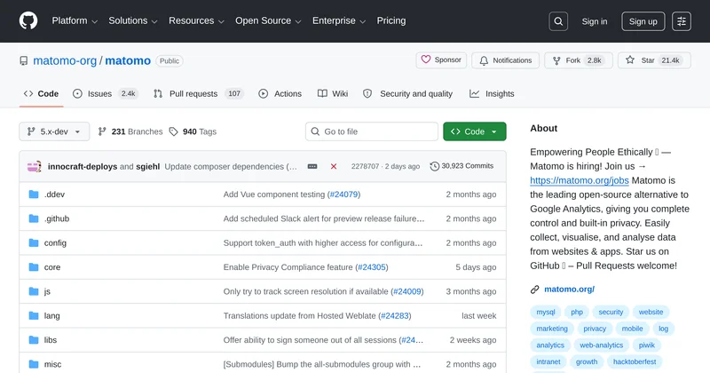 Matomo is an open-source analytics platform that provides privacy-focused web tracking and data control for users.