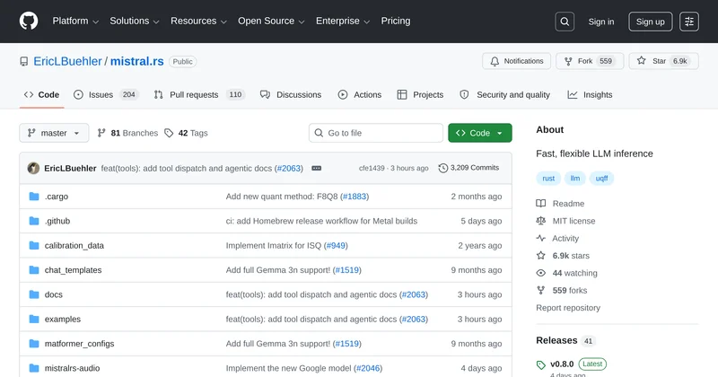 mistral.rs is a fast, flexible tool for LLM inference, supporting Rust and Python SDKs with multimodal capabilities.