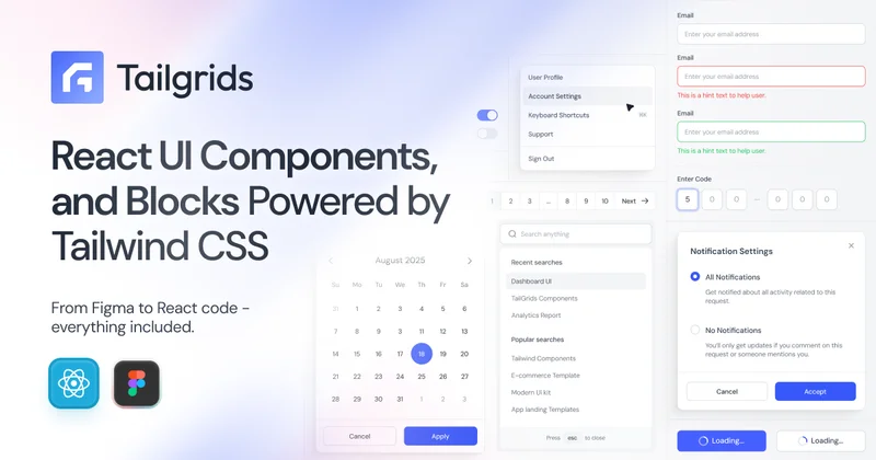 Tailgrids UI is an open-source React component library built with Tailwind CSS, designed to help developers and designers build production-ready applications more efficiently.